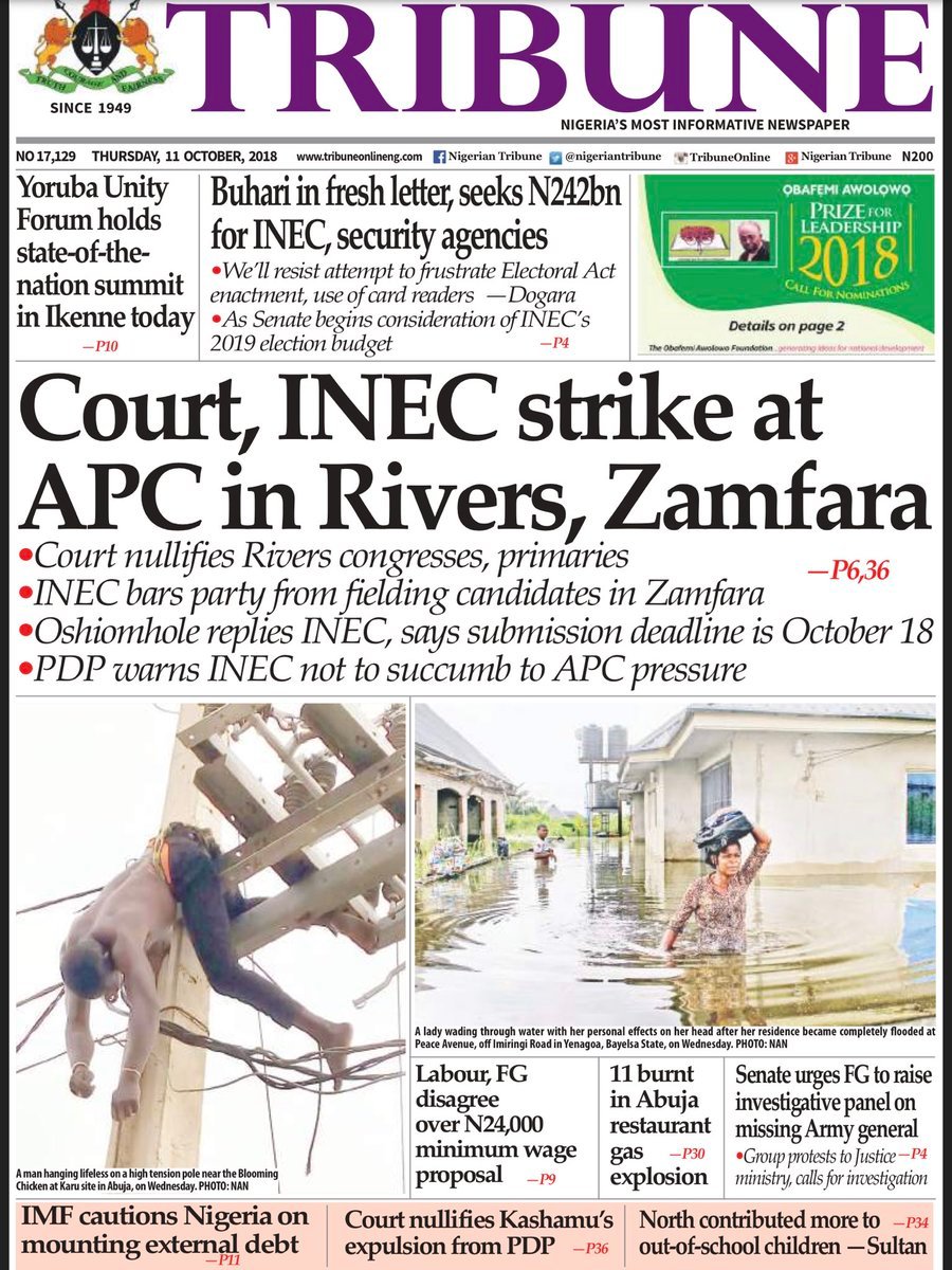Here are the front pages of the Nigerian Newspapers for Thursday 11 October 2018