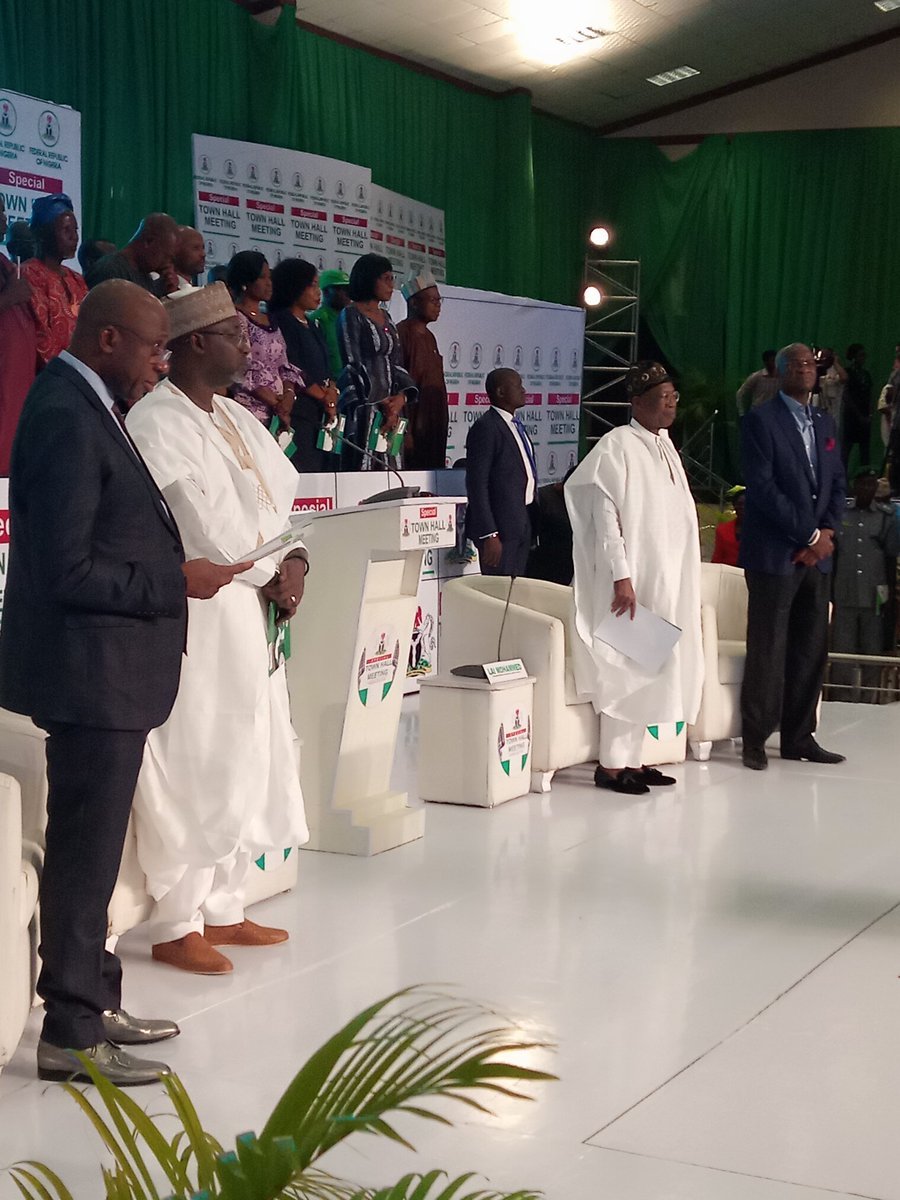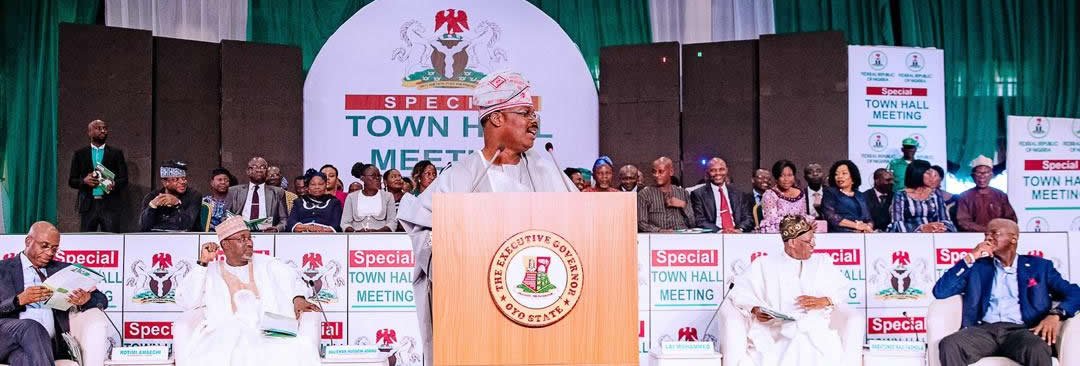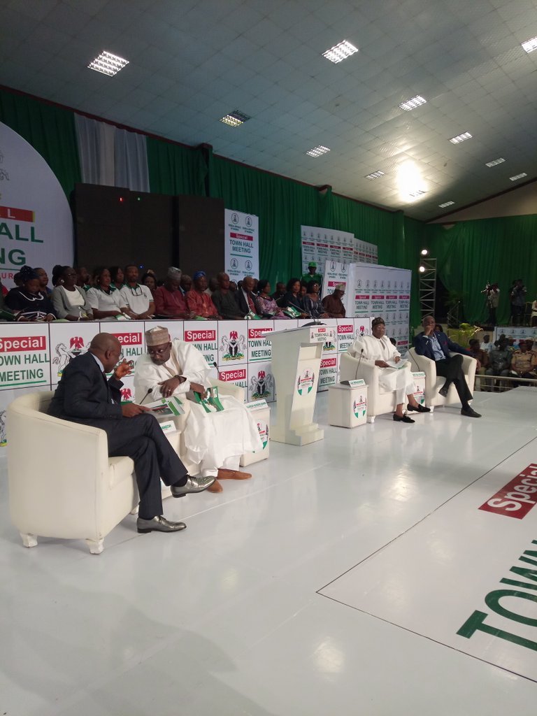 The News Agency of Nigeria (NAN) reports the Minister of Information and Culture, Alhaji Lai Mohammed led three other ministers including Fashola, Ministers of Transportation, Rotimi Amaechi and Water Resources, Suleiman Adamu to the town hall meeting.
