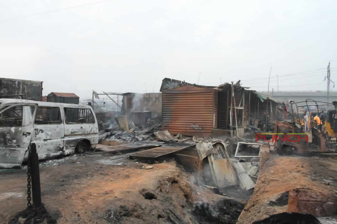 A fire caused by an oil spill has burnt cars, trucks, shops and homes at Abule Egba in Lagos.