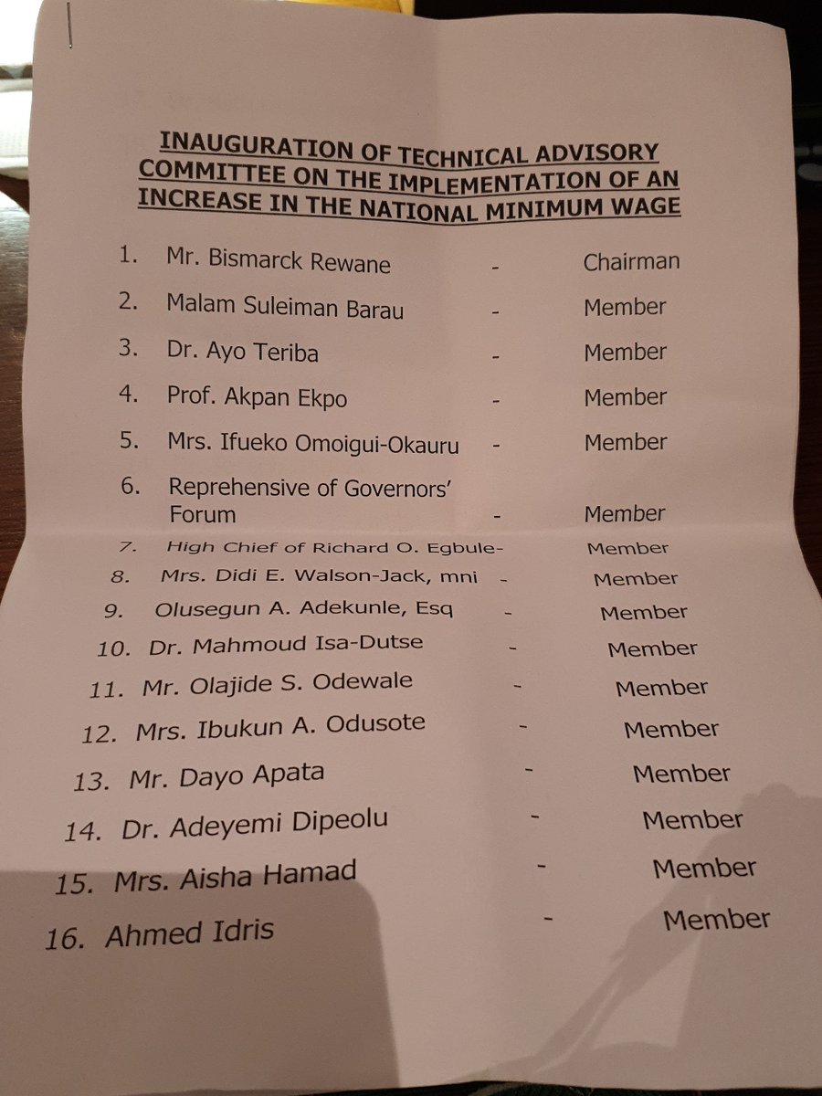 Other members of the committee include Chairman of the Federal Inland Revenue Service (FIRS), Dr Babatunde Fowler, a representative of the Nigeria Governors Forum (NGF), Chairman of the National Salaries, Incomes and Wages Commission; Richard Egbule, Permanent Secretary, Service Welfare Office of the Head of Service of the Federation; Mrs. Didi Walson-Jack, Permanent Secretary of General Service Office, Office of the Secretary to the Government of the Federation; Olusegun Adekunle, Permanent Secretary Ministry of Finance; Dr. Mahmoud Isa-Dutse, Permanent Secretary of Ministry of Budget and National Planning; Olajide Odewale, Permanent Secretary of Ministry of Labour; Mrs. Ibukun Odusote, and Solicitor General Of the Federation and Permanent Secretary of ministry of Justice; Mr. Dayo Apata.