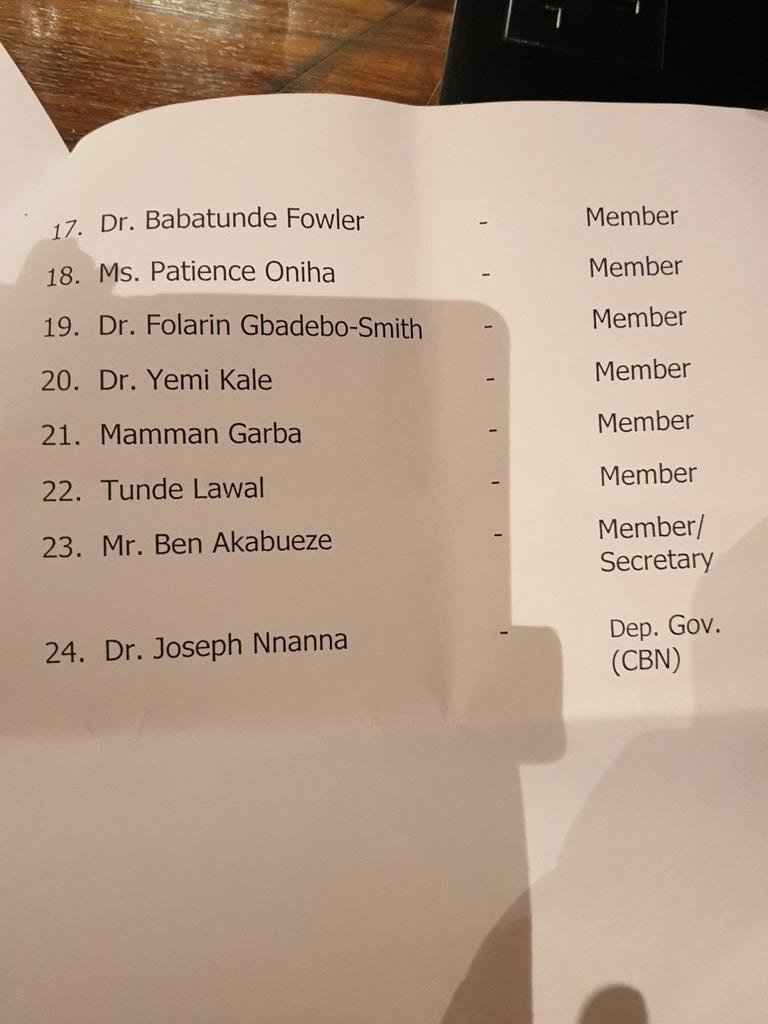 Others are Special Adviser to the President on Economic Matters, office of the Vice President; Dr. Adeyemi Dipeolu, Deputy Governor of the Central Bank of Nigeria; Economic Policy Dr. Joseph Nnanna, Accountant General of the Federation; Ahmed Idris, Director General Debt Management Officer; Ms. Patience Oniaga, Director General National Institute of Social and Economic Research; Dr. Folarin Gbadebo-Smith, Statistician General, National Bureau of Statistics; Dr. Yemi Kale, Mrs. Aisha Hamad, Mamman Garba and Tunde Lawal.