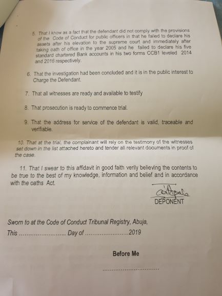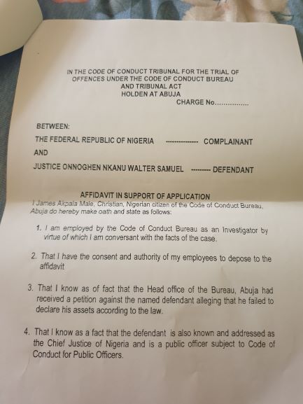 With the application filed, the CJN may be docked as early as Monday 14 January before the Justice Danladi Umar CCT, in Abuja, and there are indications the application includes a request for an order of the tribunal for the Chief Justice to vacate his office at the Supreme Court in order to concentrate on answering to the charges.