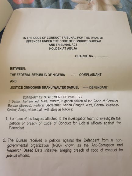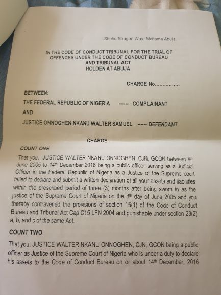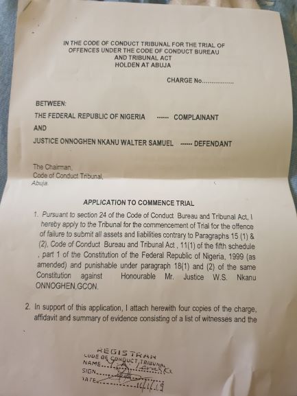 “The charge against Onnoghen, we understand has already been filed and served on him last Friday at his official residence in Abuja preparatory to his appearance at the Tribunal.