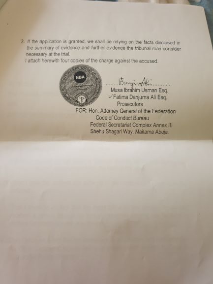 The FG filed an application against the CJN to the Code of Conduct Tribunal dated January 11 and signed by two senior lawyers at the Code of Conduct Bureau, CCB, Musa Ibrahim Usman and Fatima Danjuma Ali.
