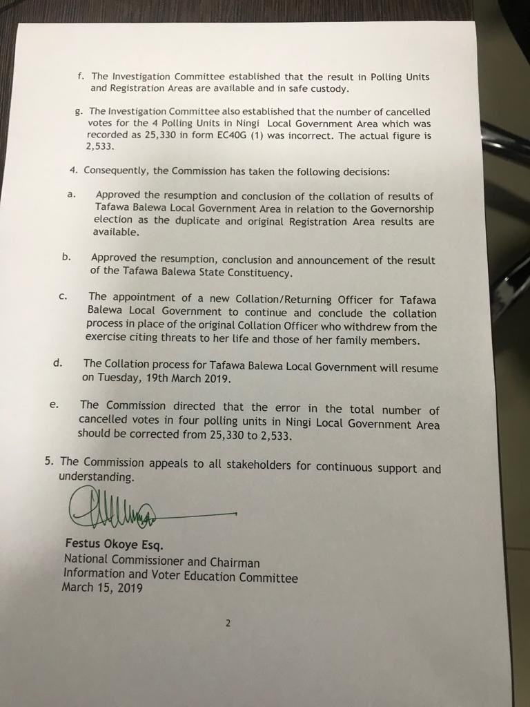 The Independent National Electoral Commission (INEC) has suspended the final collation of results for Bauchi State gubernatorial election earlier scheduled for today.