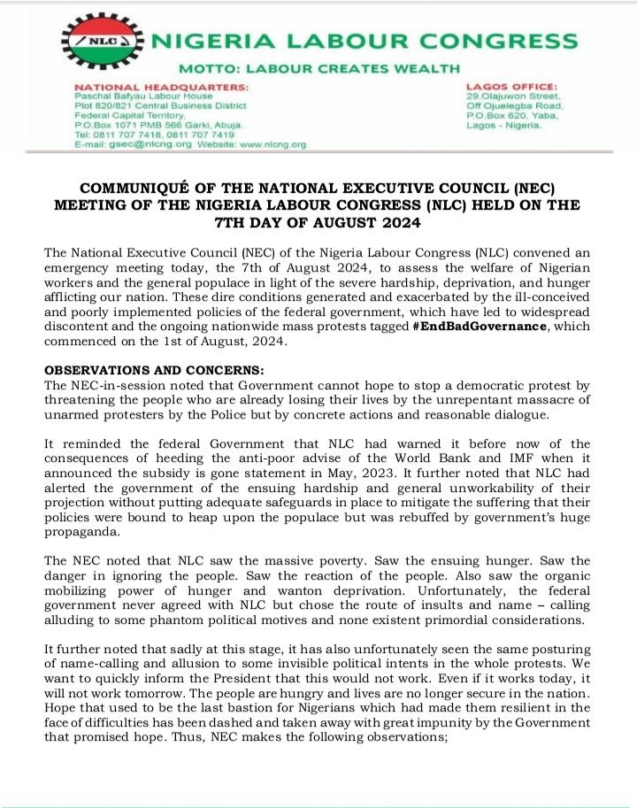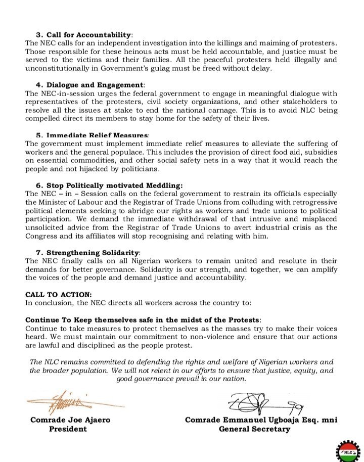 It also condemned the government for the “manner that security agents manhandled protesters in many parts of the country, and the needless bloodshed that ensued” and threatened to go on a nationwide strike if the “harassment continues.”