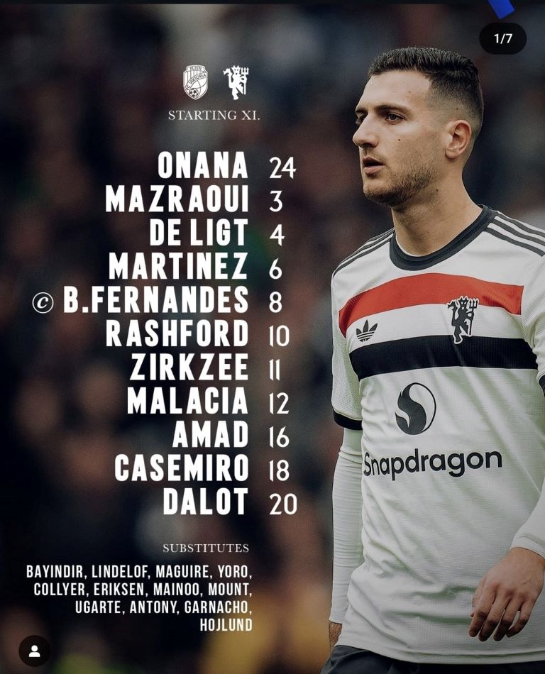 Manchester United: Andre Onana, Noussair Mazraoui, Matthijs de Ligt, Lisandro Martínez, Diogo Dalot, Casemiro, Bruno Fernandes, Tyrell Malacia, Amad Diallo, Marcus Rashford, Joshua Zirkzee. Substitutes: Rasmus Hojlund, Mason Mount, Antony.