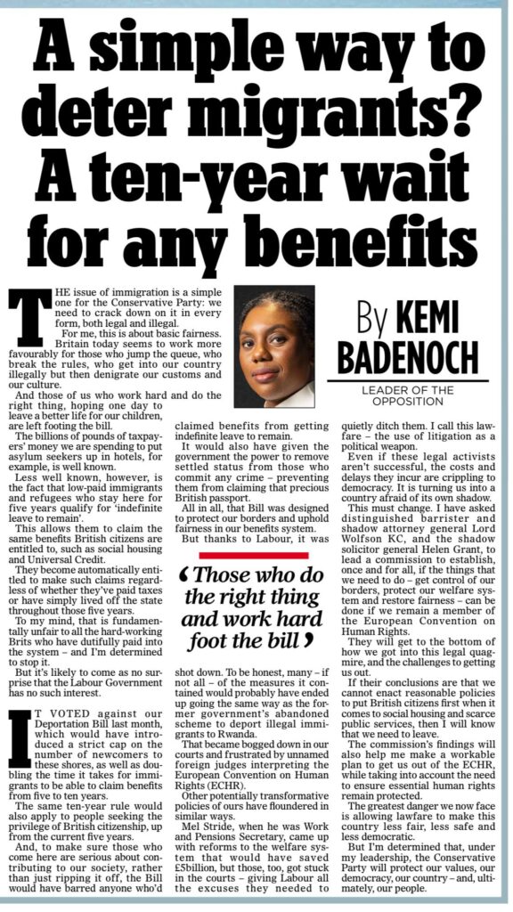 In a recent piece, Badenoch shared her strong position on the matter. “The issue of immigration is a simple one for the Conservative Party: we need to crack down on it in every form, both legal and illegal.”