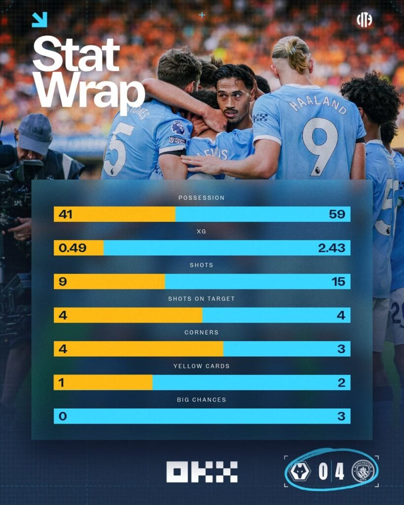 City dominated every aspect of the game. They had 69% possession, completed 615 passes, and took 16 shots. Wolves managed just five attempts, with only one on target.