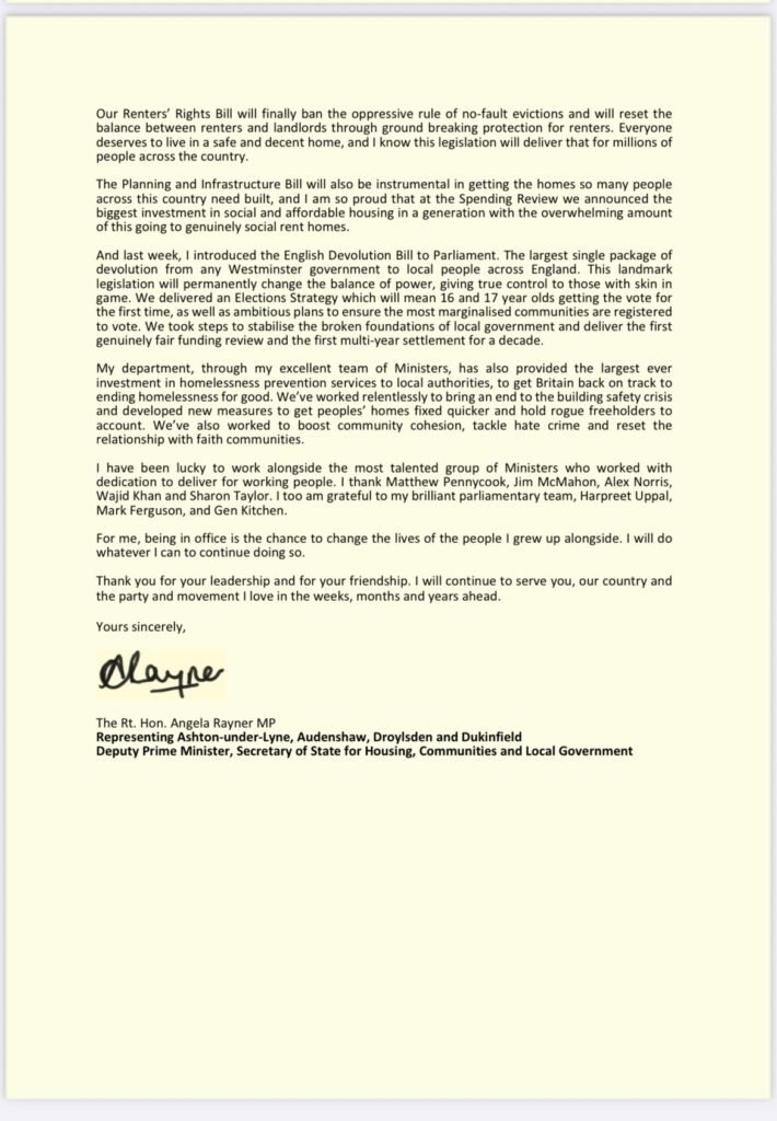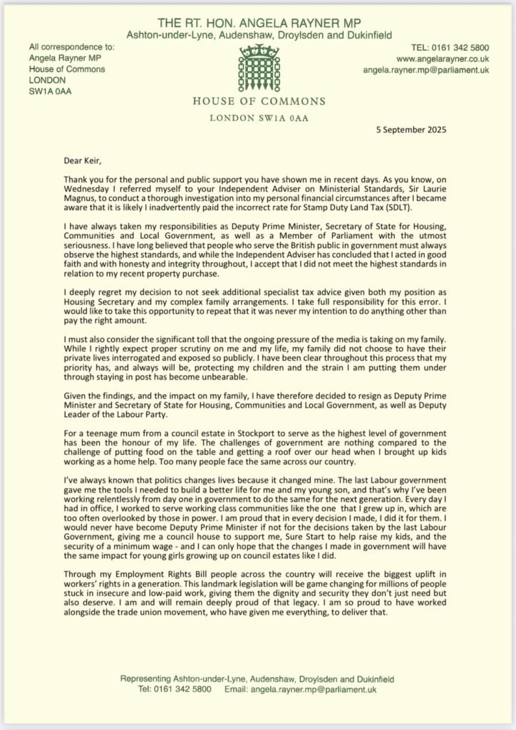 “I accept that I did not meet the highest standards,” Rayner wrote in her resignation letter to Starmer. She also stepped down as Housing Minister and Deputy Leader of the Labour Party.