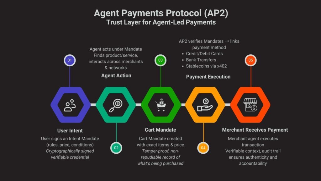 AP2 aims to answer these questions by providing a single standard across industries. It supports multiple payment types—cards, stablecoins, and bank transfers—ensuring transactions remain secure and accountable.