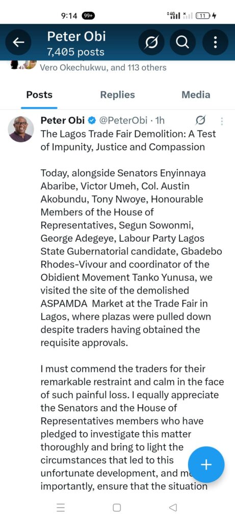 The former governor of Anambra State and Labour Party presidential candidate in 2023, Peter Obi on Tuesday, visited the Lagos Trade Fair Market demolition site.