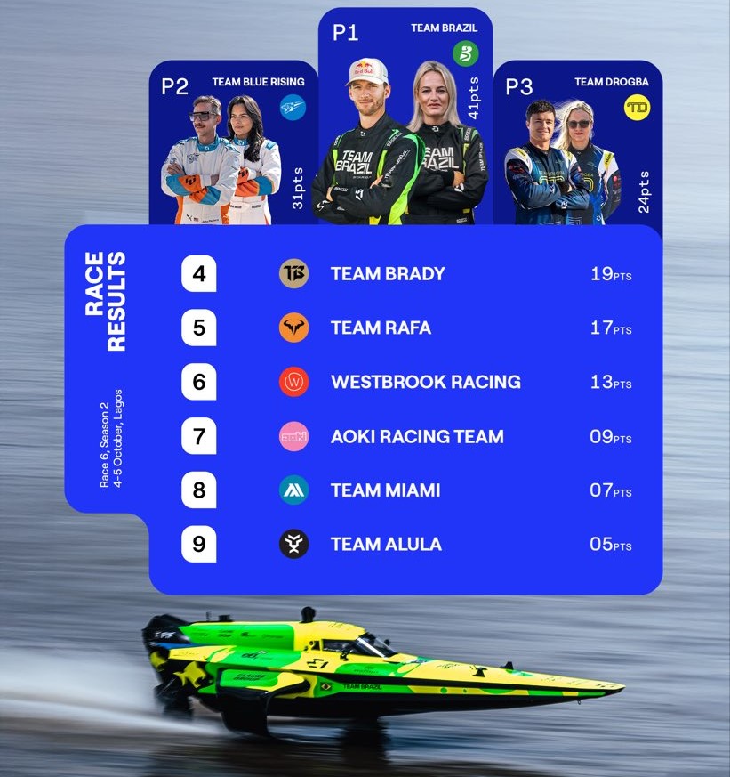 Team Brady, owned by NFL legend Tom Brady, maintained their lead atop the championship standings despite finishing fourth in Lagos. They now sit at 154 points, just three ahead of Team Rafa, owned by tennis champion Rafael Nadal, with 151. Kohli’s Blue Rising holds third with 145 points.