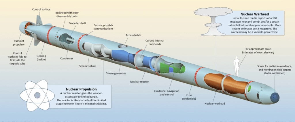 According to Russian defense sources, the Poseidon carries a multi-megaton nuclear warhead, potentially over 2 megatons — more than 130 times the force of the Hiroshima bomb.