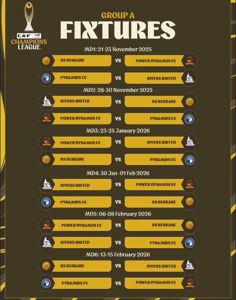 Rivers United will face reigning champions Pyramids FC of Egypt, Moroccan side RS Berkane, and Zambia’s Power Dynamos.