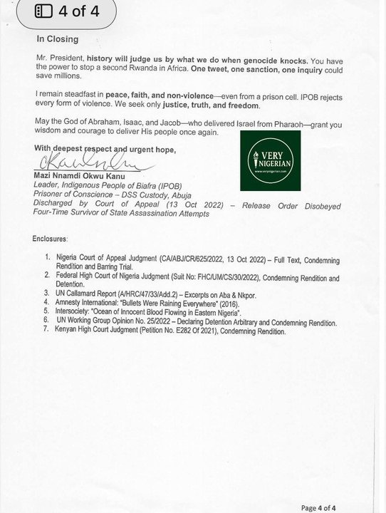 Signing off as “Mazi Nnamdi Okwu Kanu, Leader, Indigenous People of Biafra (IPOB), Prisoner of Conscience – DSS Custody, Abuja,” Kanu reaffirmed his commitment to non-violence and faith: “We seek only justice, truth, and freedom, even from a prison cell.”