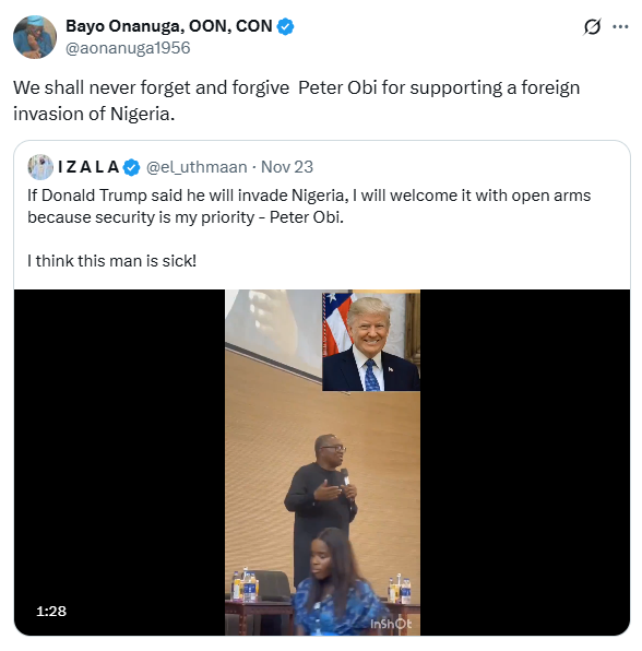 In a post on X (formerly Twitter), Bayo Onanuga, Special Adviser to President Tinubu on Information and Strategy, declared: “We shall never forget and forgive Peter Obi for supporting a foreign invasion of Nigeria.”