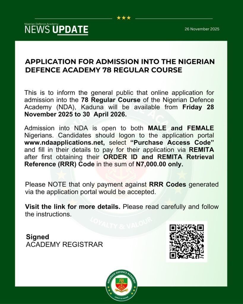 “This is to inform the general public that online application for admission into the 78 Regular Course of the Nigerian Defense Academy (NDA), Kaduna will be available from Friday 28 November 2025 to 30 April 2026,” the statement read.