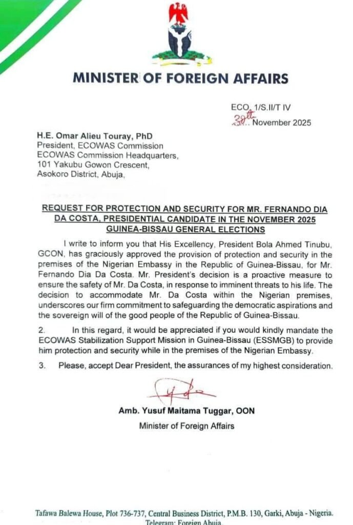 In a letter dated November 30, 2025, Minister of Foreign Affairs Yusuf Maitama Tuggar wrote to ECOWAS Commission President Omar Alieu Touray, citing “imminent threats” to Da Costa’s life.