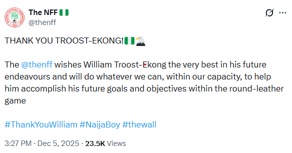 The NFF said it will support him in his next steps within the global game. “We will do whatever we can to help him accomplish his future goals within the round-leather game,” the federation concluded.