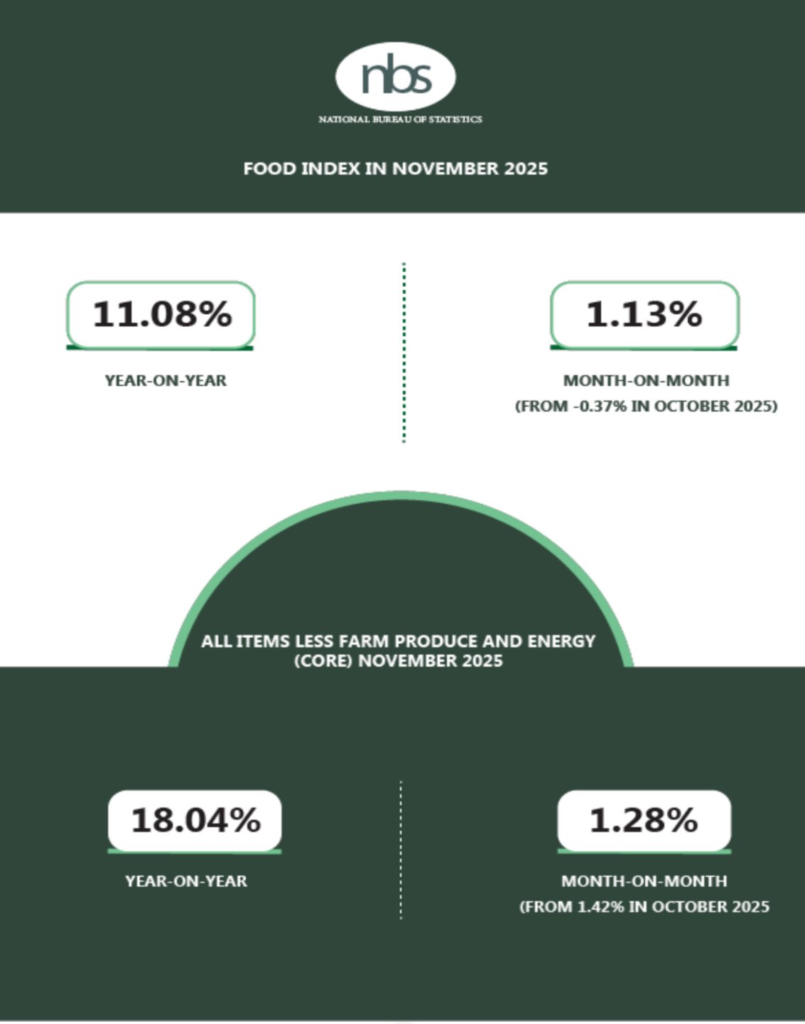 Core inflation, which excludes volatile items such as energy and farm produce, stood at 18.04 per cent year-on-year in November, down from 28.75 per cent in November 2024. On a monthly basis, core inflation was 1.28 per cent, slightly lower than the 1.42 per cent recorded in October.