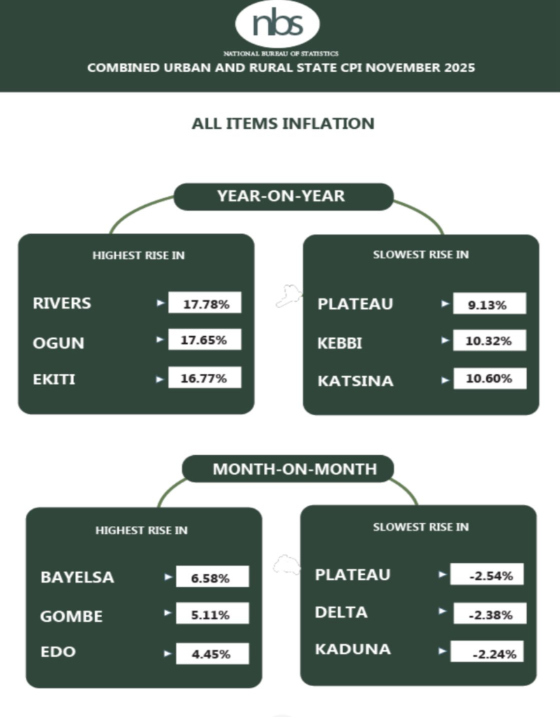 Across states, food inflation varied significantly. Kogi, Ogun, and Rivers recorded the highest year-on-year increases at 17.83 per cent, 16.52 per cent, and 16.11 per cent respectively. Imo, Katsina, and Akwa Ibom reported the lowest increases at 3.52 per cent, 3.65 per cent, and 4.52 per cent.