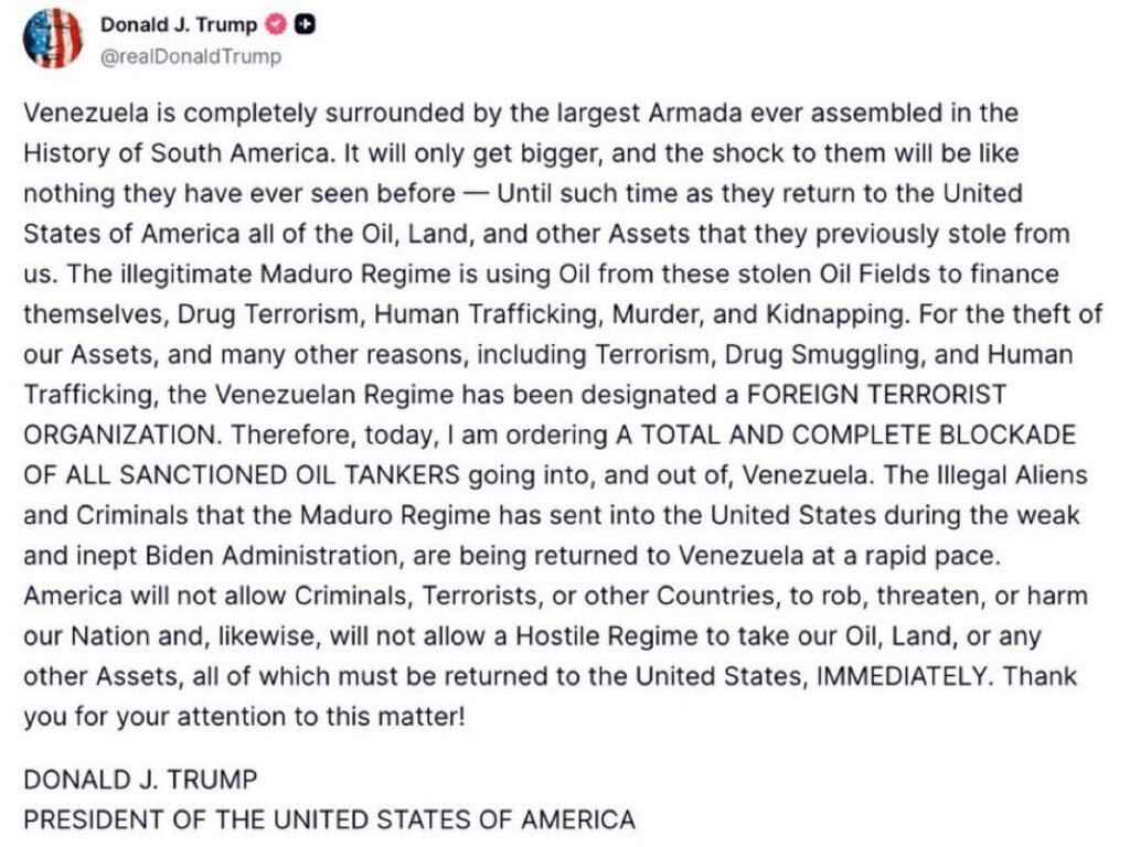 “Venezuela is completely surrounded by the largest Armada ever assembled in the History of South America,” Trump wrote, promising further escalation.