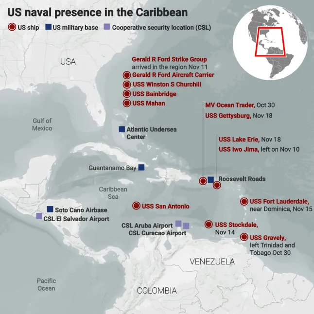 Operation Southern Spear currently involves nearly a dozen U.S. Navy ships and about 12,000 sailors and Marines deployed in the Caribbean, supported by aircraft including P-8 Poseidon patrol planes, V-22 Ospreys, and bomber flights near Venezuelan airspace.
