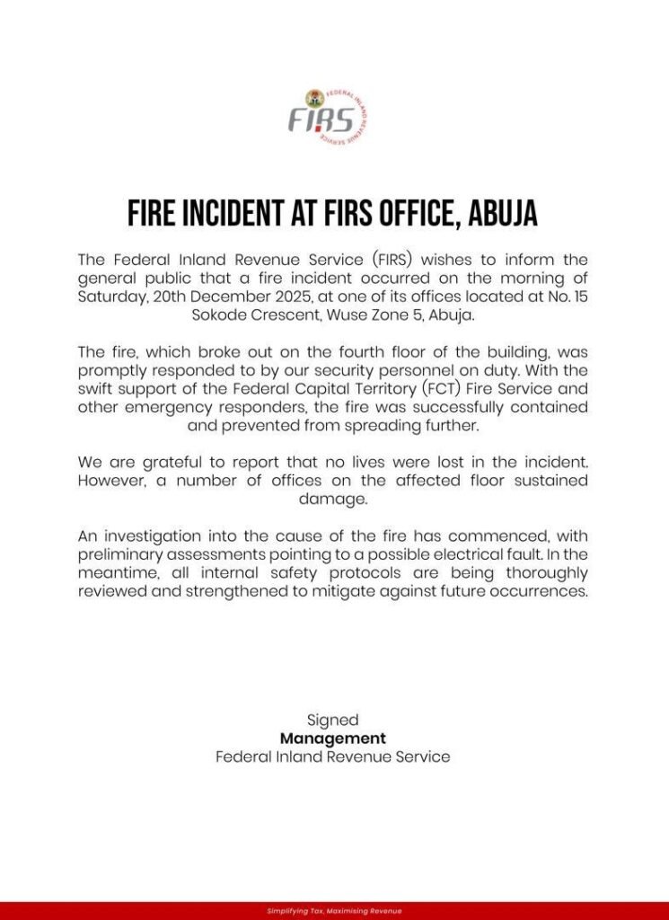 The Federal Inland Revenue Service (FIRS) has confirmed that a fire broke out at its office located at No. 15 Sokode Crescent, Wuse Zone 5, Abuja, on Saturday morning.