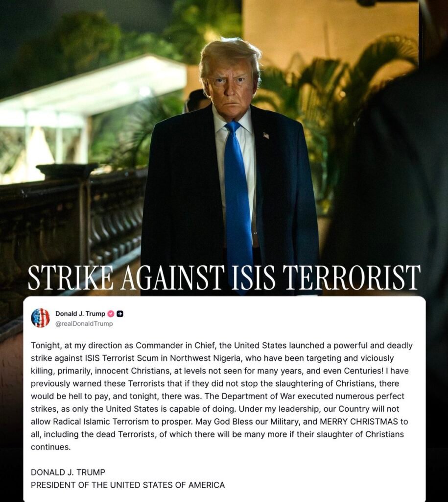 In a post on his Truth Social platform late Thursday, Trump said the strikes were directed at “ISIS Terrorist Scum” in Sokoto State, describing them as “powerful and deadly” and executed by the Department of War.
