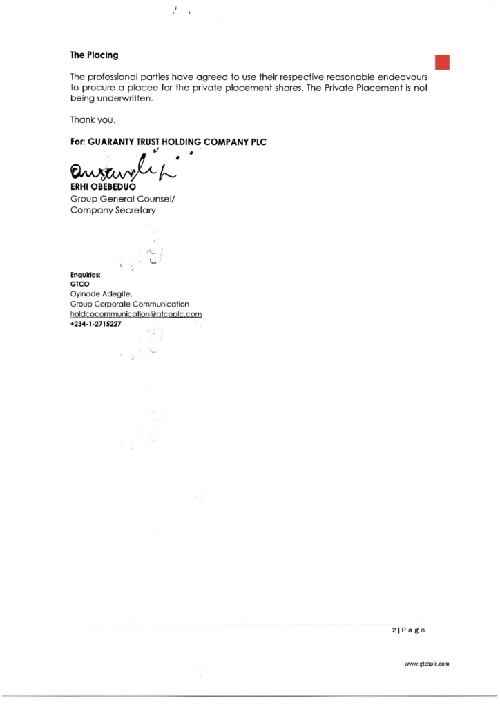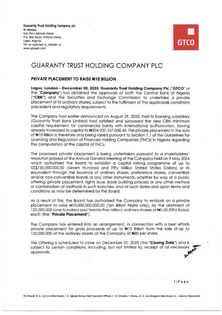 The parent company of GT Bank, Guaranty Trust Holding Company Plc (GTCO) has received approval to raise ₦10 billion through a private placement of its ordinary shares.