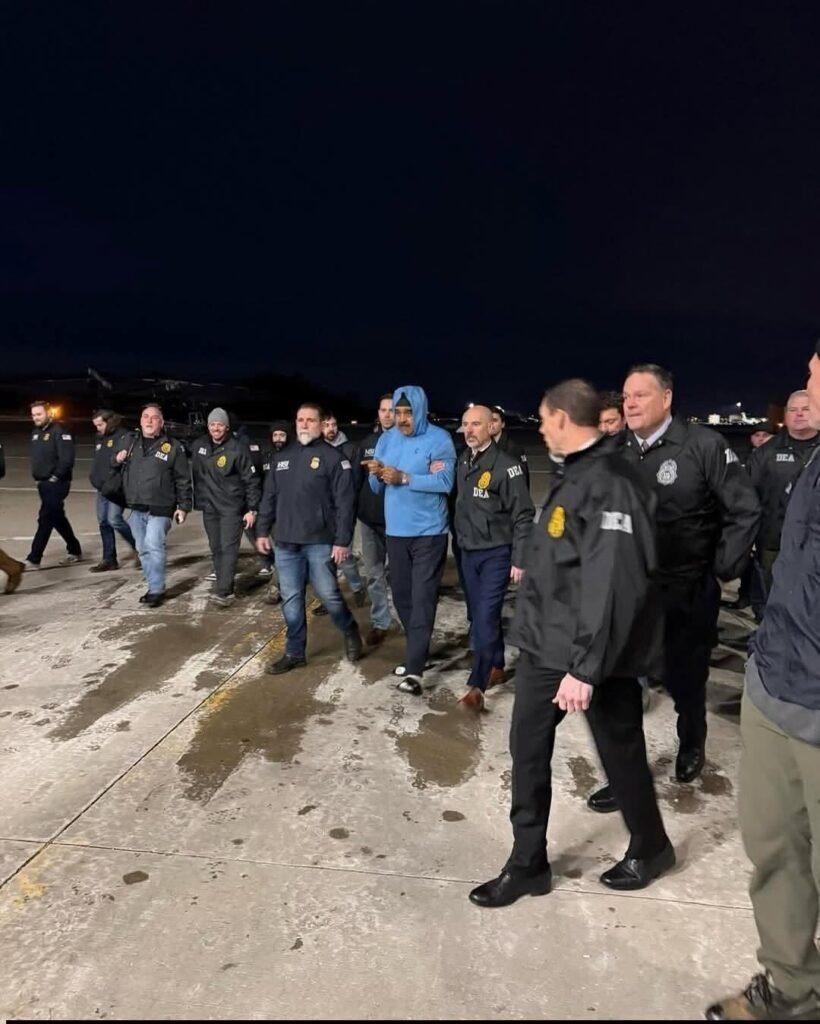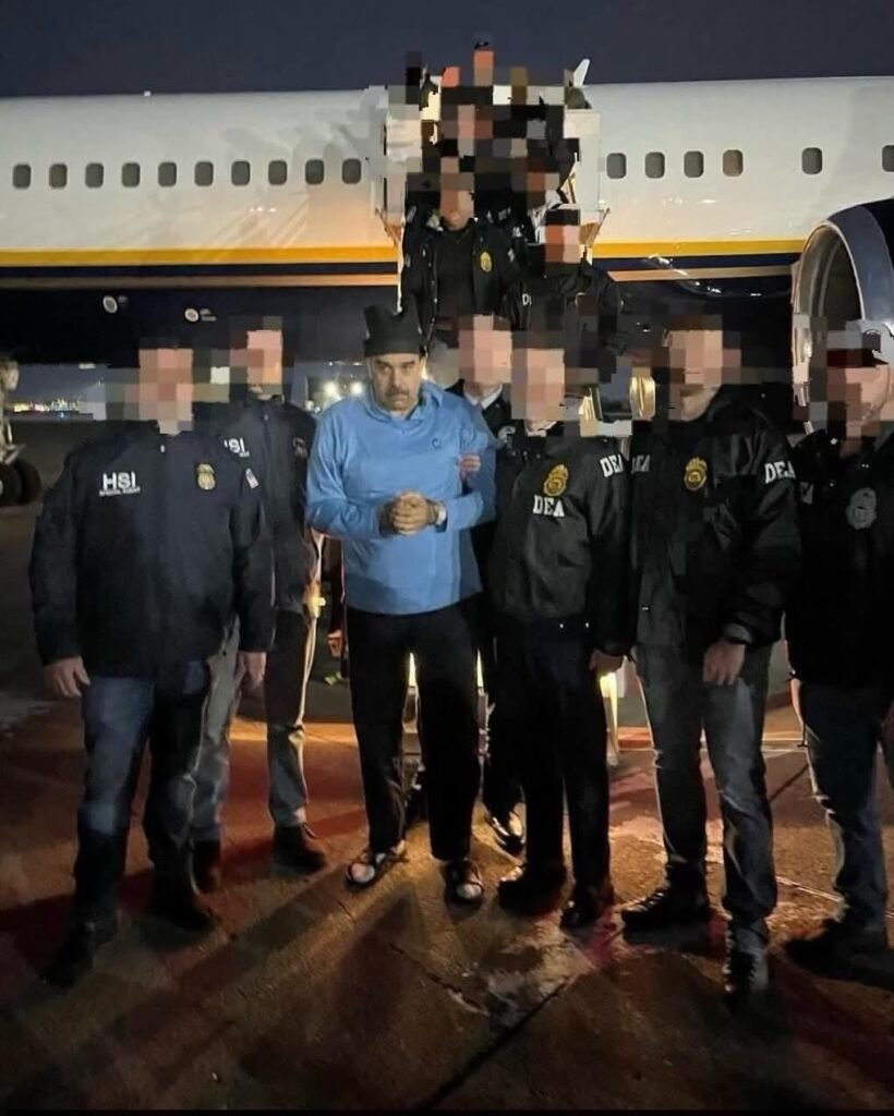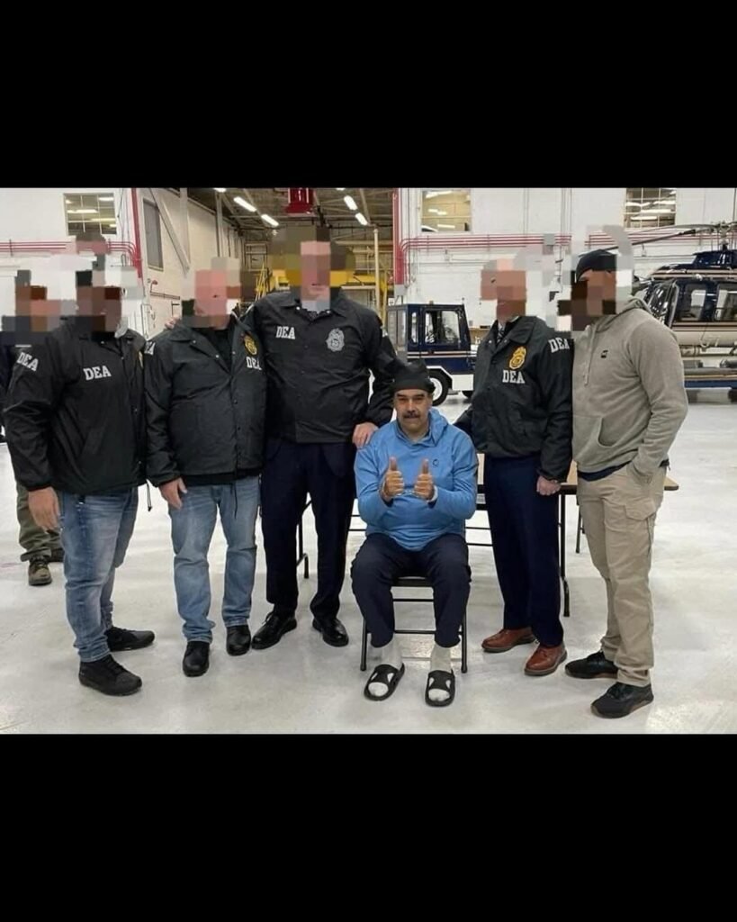 He later shared a photo purportedly showing the Venezuelan leader in custody aboard the USS Iwo Jima, with Maduro blindfolded and handcuffed.