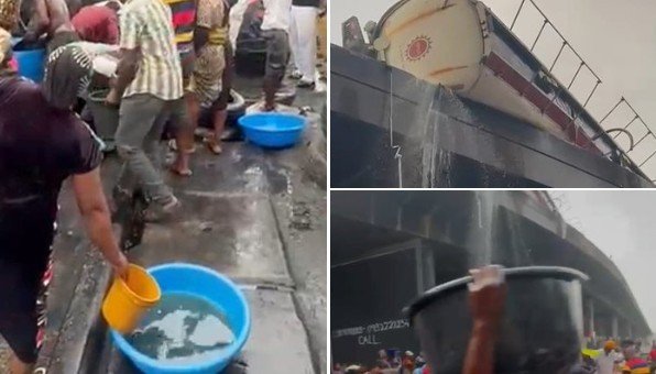 A reporter at the scene, shared a video: “Happening now at Tincan Liverpool Bridge, Apapa: A tanker overturned, with people scooping its contents from underneath the bridge.”