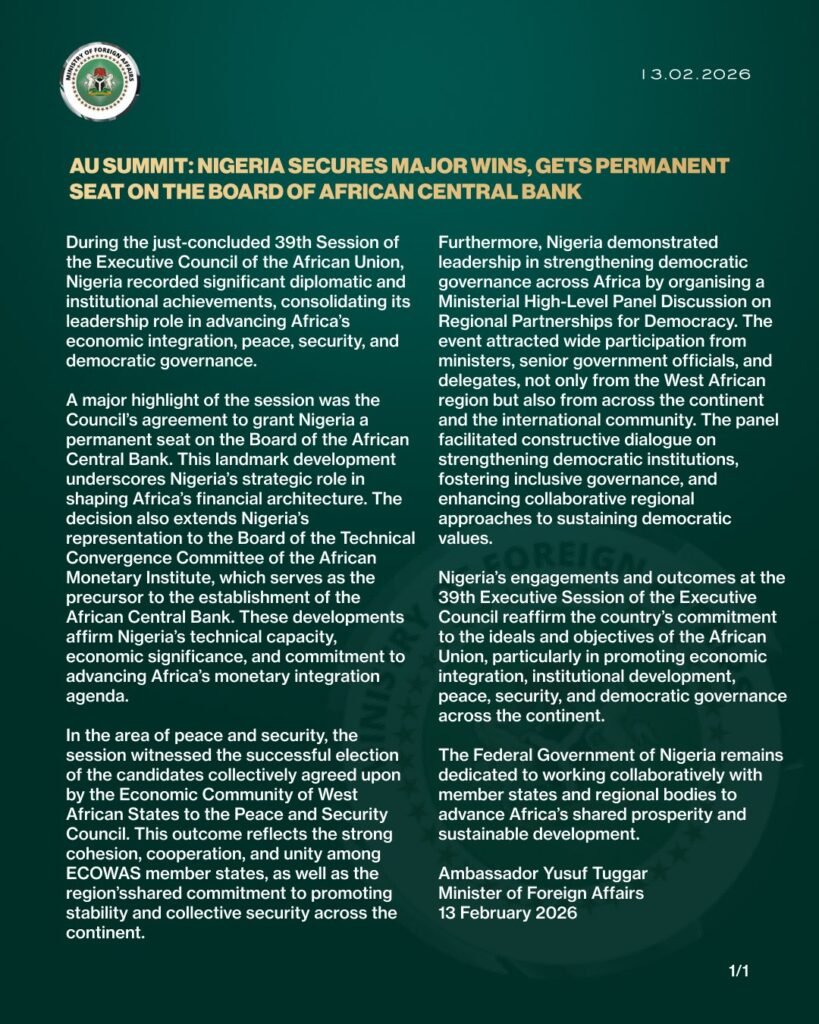“This landmark development underscores Nigeria’s strategic role in shaping Africa’s financial architecture. This decision also extends Nigeria’s representation to the Board of the Technical Convergence Committee of the African Monetary Institute, which serves as the precursor to the establishment of the African Central Bank,” Tuggar stated.