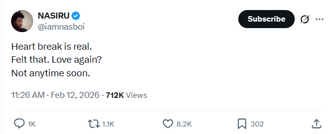 Nasiru Lawal, popularly known as Nasboi, took to his X (formerly Twitter) account to share his feelings about his recent heartbreak, describing the emotional impact as deeply real and unsettling. In his succinct post, the entertainer wrote: