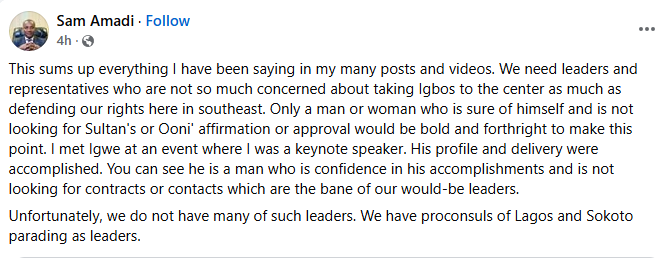 In a post after the summit, he said: “This gutsy call by Igwe Agubuzu for the RELEASE of Mazi Nnamdi Kanu reflects the several meetings I had held with him on the same matter with Obi of Onitsha, Archbishop Opoko, Dr. Chris Okoye, Dr. Uju Agomuo, etc. Kudos to His Majesty for telling President Tinubu to his face.”