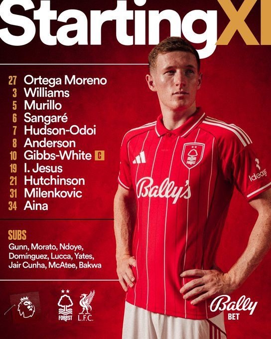 The first half was cagey, with Forest pressing aggressively and Liverpool struggling to create clear chances. Forest’s midfield trio of Sangaré, Gibbs-White, and Anderson disrupted Liverpool’s rhythm, while Hudson-Odoi and Hutchinson provided width and pace.