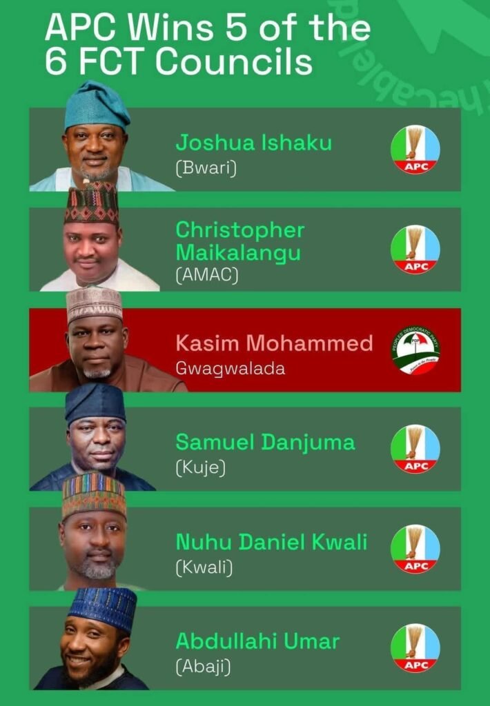 Thus, APC secured five of six chairmanships, consolidating its dominance in the FCT, while PDP’s lone victory in Gwagwalada provided a symbolic foothold.