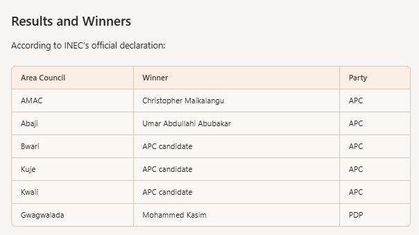 Turnout was mixed: higher in rural councils like Abaji and Kwali, lower in urban centers like Bwari and Dawaki.