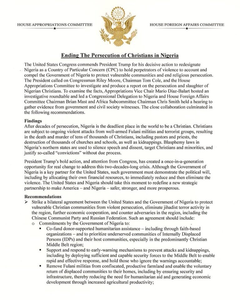The United States House Committees on Appropriations and Foreign Affairs have submitted a report to the White House on the alleged persecution of Christians in Nigeria.