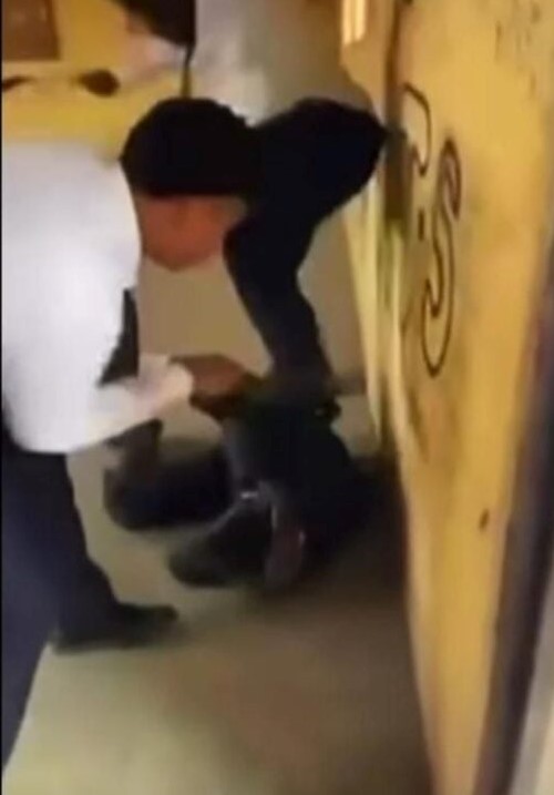 Meanwhile, a third student who recorded the incident could be heard pleading with them to stop.