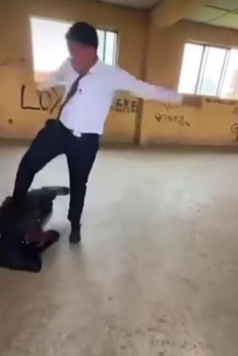 At one point in the video, one of the students was seen dragging the victim by his suit and stomping on his chest while the boy cried in pain.