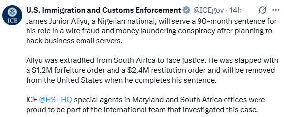 “James Junior Aliyu will serve a 90-month sentence for his role in a wire fraud and money laundering conspiracy after planning to hack business email servers,” the ICE statement read.