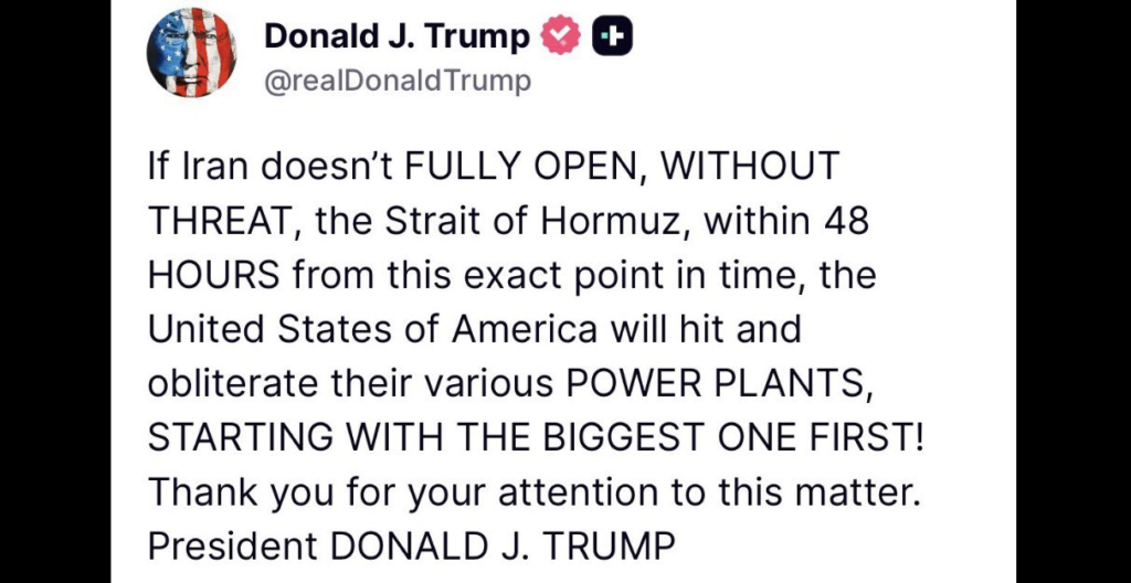 “If Iran doesn’t FULLY OPEN… the Strait of Hormuz… the United States… will hit and obliterate their various POWER PLANTS,” Trump stated. This signals a sharp spike in the US-Israel conflict with Tehran.