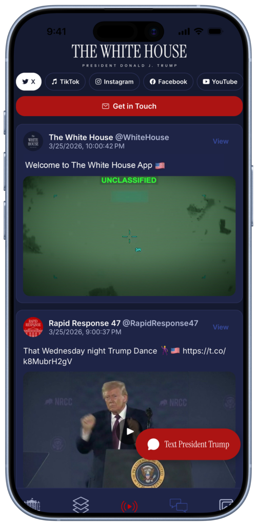 The application is not limited to passive news consumption. It features several interactive tools, including a “Text President Trump” button and consolidated social media feeds.